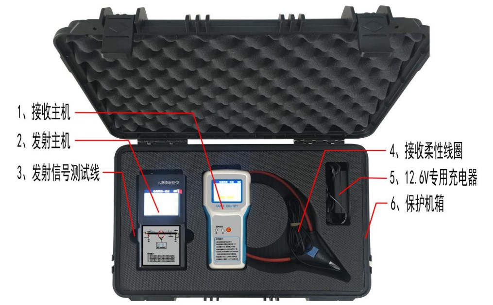 2、該電纜識別儀與常規的識別儀不同,采用了最新的通信技術,在發射端采用單片機技術對發射信號進行編碼、功率驅動,將信號耦合到電纜上;接收機中的單片機對接收的相位編碼信號解碼和相位識別。根據目標電纜上的信號相位特征的少有性將目標電纜從一大束電纜中識別出來。因此工作性能可靠,對超長電纜也能做到準確判別,是一種輕小型、緊湊型、便攜式儀器。適用于各種類型的高低壓動力電纜。