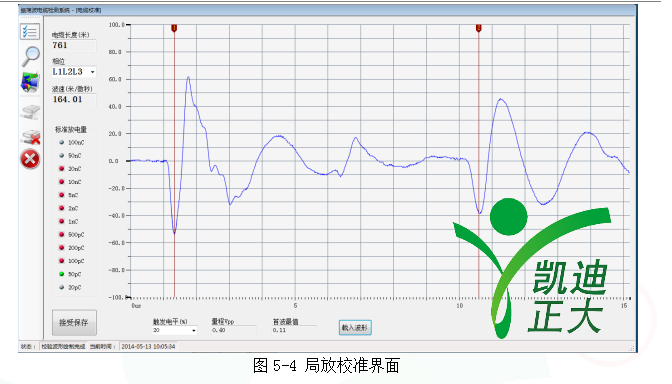 在測試軟件界面中點擊“局放校準”圖標,進入局放校準界面如圖5-4所示,局放校準界面提供20pC~100nC共12檔量程的局放校準,對被測電纜進行校準時,應和標準放電脈沖校準器的量程一一對應。現場振蕩波試驗時,須對電纜進行校準。